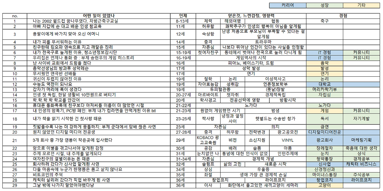 이번 한달을 하면서 나의 과거에 대한 스토리재료를을 많이 찾아냈다. 어릴적 차범근 축구교실 했을 때 이야기, 어머니가 용산에서 바가지 써서 게임기 몰래 사오신 이야기, 음악과 관련된 이야기, 어느날 머리에 혹이 생긴 이야기, 자취생활 이야기, 연애이야기, 고양이 이야기 그리고 생각도 하기 싫은 비트코인 이야기까지. 한달자기발견을 하며 읽은 책 <손바닥 자서전 특강>이 도움이 많이 되었다.