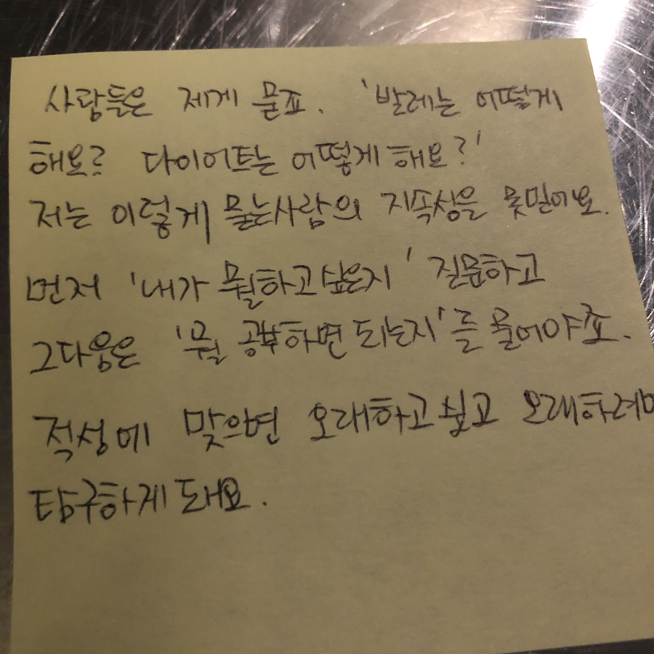 사람들은 제게 묻죠. ‘발레는 어떻게 해요?’ ‘다이어트는 어떻게해요?’ 저는 이렇게 묻는 사람의 지속성을 못믿어요. 먼저 ‘내가 뭘하고 싶은지’ 질문하고 그 다음은 ‘뭘 공부하면 되는지’ 를 물어봐야죠. 적성에 맞으면 오래하고 싶고 오래하려면 탐구하게 되요.