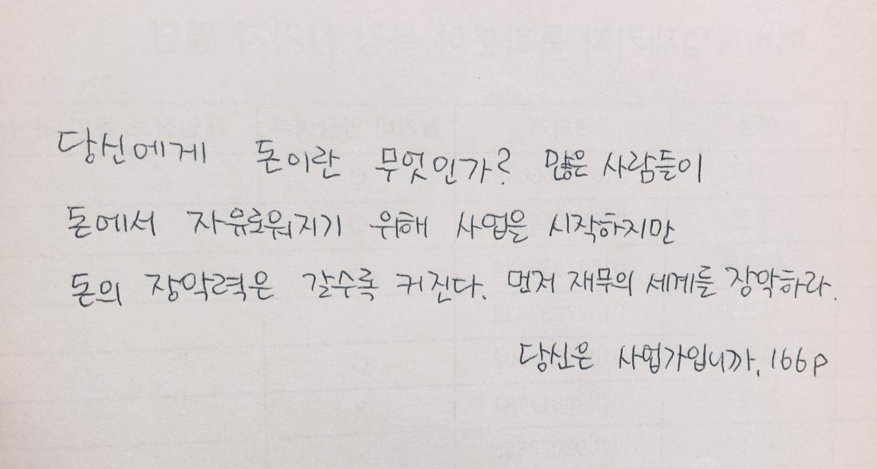 사업가는 돈과 친해져야 한다. 돈이 나가고 들어오는 흐름을 늘 파악하고 있어야 한다. 사업가가 돈을 모르는 건, 마치 배를 항해하는 선장이 바다를 모르는 거랑 다름 없다. 자칫 가라앉을 수 있다.