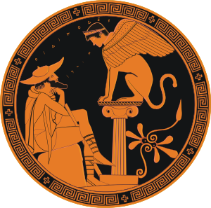 오이디푸스와 스핑크스한편 테베에서는 스핑크스가 등장한다. 스핑크스가 테베로 오는 길목을 지키고 수수께끼를 맞히지 못하는 사람을 죽여버리는 바람에 테베가 혼란스러웠고, 남편도 잃었던 찰나에 테베의 왕비 이오카스테는 스핑크스를 무찌르는 사람과 결혼할 것이라는 공약?을 내세운다. 하필 우연히 오이디푸스가 스핑크스의 난제를 맞추어 이오카스테와 결혼을 하게 된다.