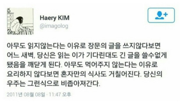 조금씩 그리스 생활을 기록하고는 있지만, 이렇게 하는 것이 맞는 것인지는 모르겠다. 조금 더 공부를 해서 책만큼 전문적인 내용을 담아 써야 하는지.. 독자를 감안하고 써야 하는지.... 나 혼자 발전 없이 쓰는 게 글인가. 생각이 들던 와중에 마음을 울리는 트윗을 하나 보게 되었다.