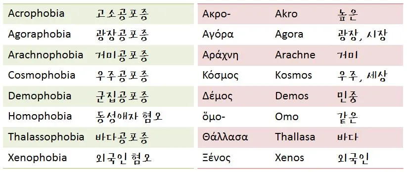 Lachanophobia(야채 공포증), Thanatophobia(죽음 공포증), Hellenologophobia(그리스어 공포증ㅋㅋㅋㅋ) 등 다른 공포증이 있다고 하는데 심리학, 의학과 관련된 용어라 다 그리스어로 되어있다.이외에도 technology, economy, ecology, logic, atom, music, poetry, microphone, telephone 등 셀 수 없는!! 그리스 단어들이 많다. 빠떼 교수님의 말씀을 빌리자면