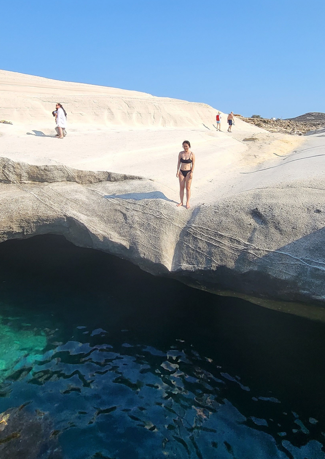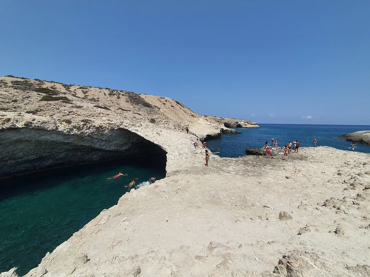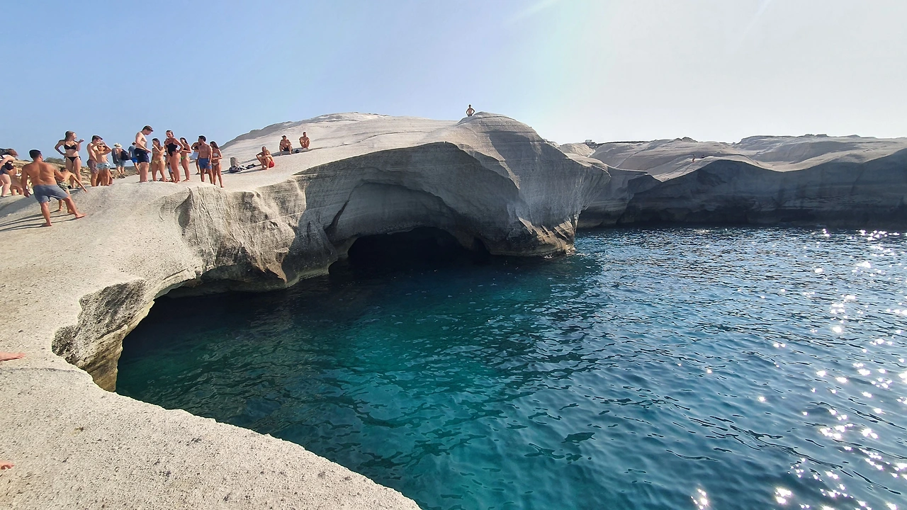 우리는 곧장 사라키니코라는 해변으로 향했다. 밀로스, 아니 그리스에서도 가장 유명한 포토스팟 중 하나로 알려진 이 해안은 화백색의 화산암으로 형성되었으며 달의 표면 풍경을 보는 것 같다. 이 해변도 모래가 있는 해변은 아주 작고, 해안바위에서 다이빙을 하며 노는 곳인 것 같다.