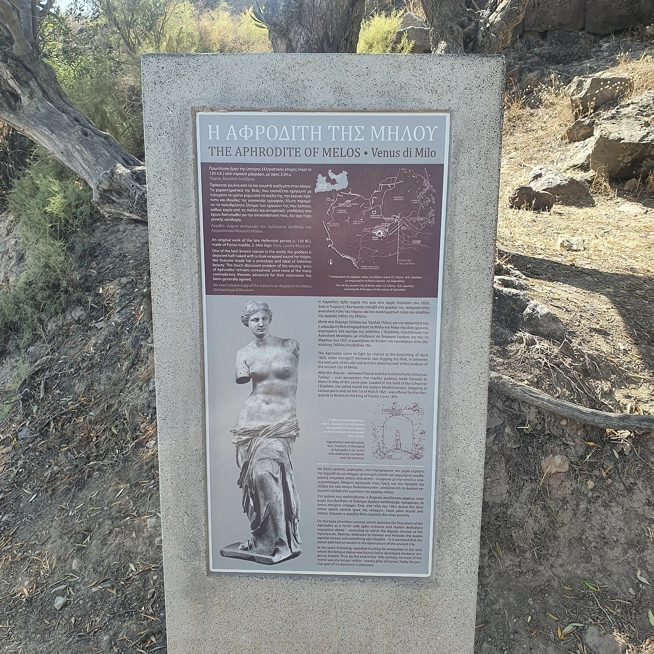 밀로의 아프로디테가 있었다는 유적지에는 아름다운 아프로디테가 아니라 설명만이 자리하고 있었다. 밀로의 아프로디테는 1820년 요르고스 켄트로타스라는 사람이 자신의 밭을 파다가 우연히 발견하였다. 오스만제국(당시 그리스는 오스만 튀르크의 지배 하에 있었다)과 프랑스 사이에서 이 석상의 소유권을 두고 다투다 결국 프랑스의 손에 넘어갔고, 1821년 3월 프랑스 땅을 밟아 루이 18세에게 바쳐지게 된다. 결국 진짜 밀로의 비너스를 보려면 파리의 루브르 박물관으로 가시면 됩니다.