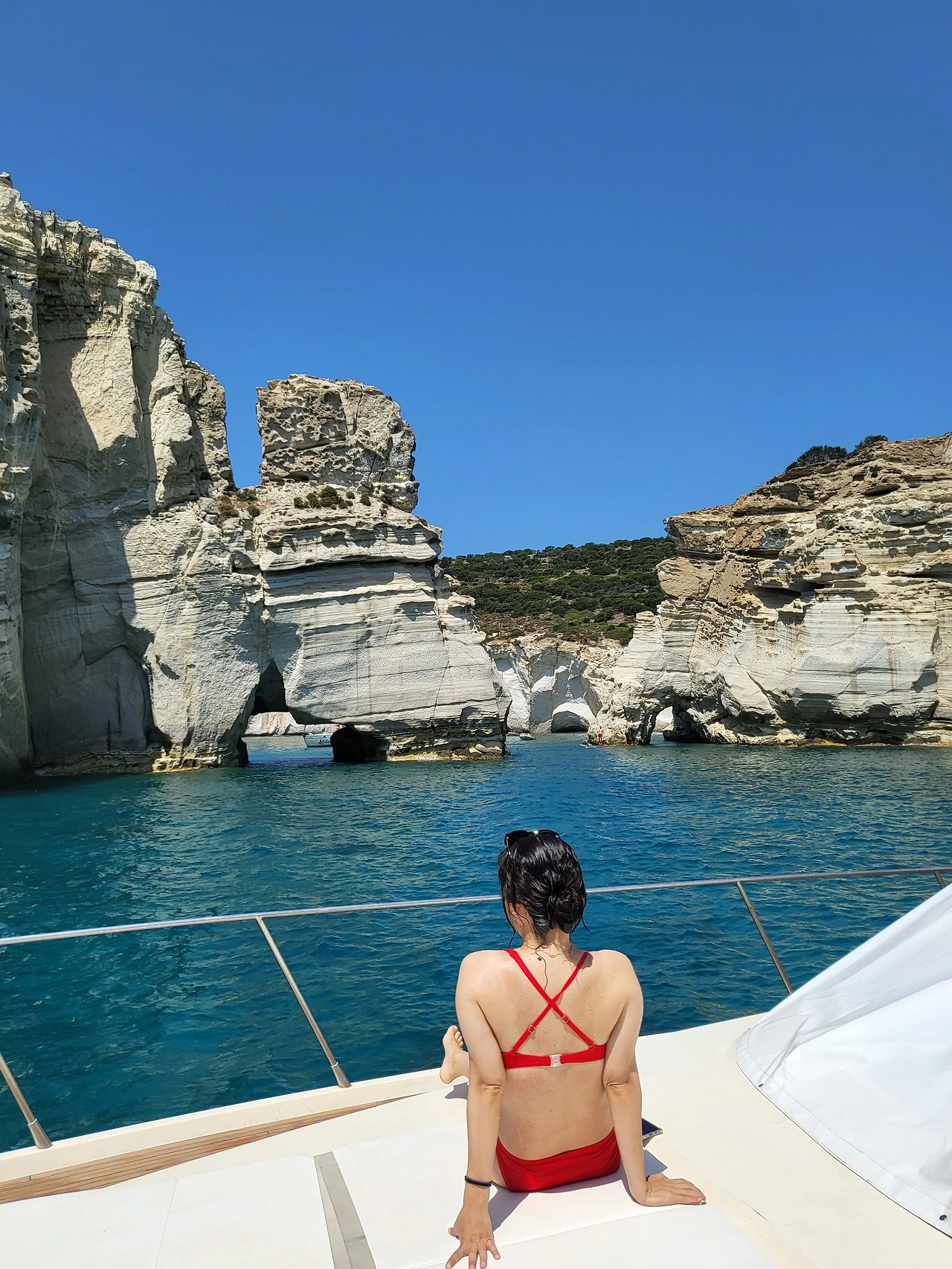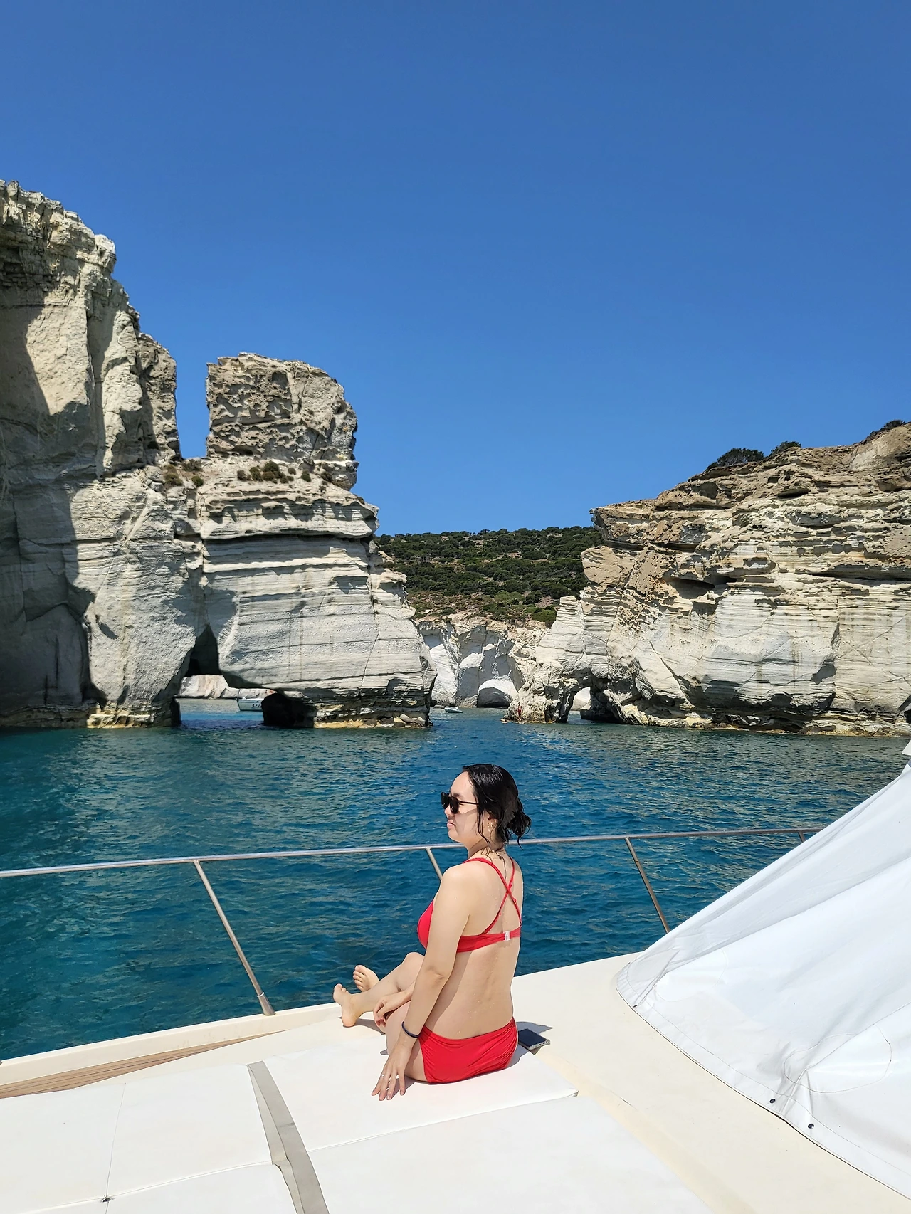 밀로스의 아름다운 바다를 더 보기 위해 요트투어도 했다. 누워 잔 덕분에 수영복 모양이 아주 찐!하게 남아버렸지만 요트에서도 행복하게 다이빙을 즐겼다.