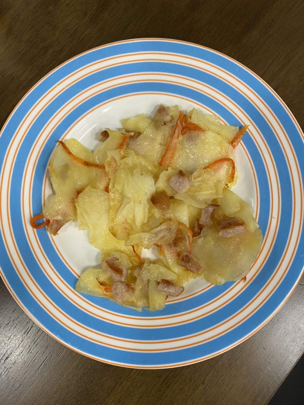 감자전이라기보다는 감자볶음에 가까운 것이기도 한 이 음식은 감자를 얇게 슬라이스 한 뒤 부침가루를 묻혀 기름에 튀기듯 부친 것이다. 감자만 부치면 심심하니까 당근을 넣어 식감도 살리고 소시지를 썰어 넣어 짭조름한 맛도 더했다. 색감이 살아 음식이 한결 멋스러워지기도 했다. 단순한 음식 같지만 과정을 살펴보면 꽤 손이 많이 가는 음식이었다.