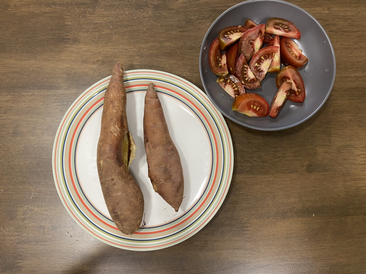 어젯밤 계획했던 대로 아침은 고구마를 굽고 토마토를 숭덩숭덩 썰어서 간단하게 먹었다. 아침 일찍부터 은근한 열로 구워낸 고구마는 수분이 날아가 젤리처럼 쫀득해져 본래의 맛보다 더 달콤했고 토마토에는 여름의 싱그러움이 가득 묻어있었다. 만족스러운 아침식사였다.