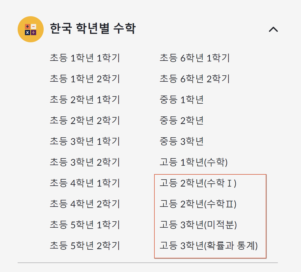 고2, 고3 과정을 다룬 강의는 많지만 대부분이 수능을 겨냥한 강의다 보니 우리의 목표와는 약간 다릅니다. 우리의 공부 목표는 뛰어난 문제풀이 스킬보다는 다음 과정을 공부하기 위한 개념 학습이죠. 양질의 수학 강의로 세계적 인기를 얻고 있는 칸아카데미를 통해 공부하시면 됩니다. 칸아카데미 홈페이지에 들어가보시면 '한국 학년별 수학' 부분이 있는데요. 이 중 고2, 고3 과정을 다룬 '수학I', '수학II', '미적분', '확률과 통계' 과목을 공부하시면 됩니다. 다음 사진의 빨간 네모를 참고하세요!