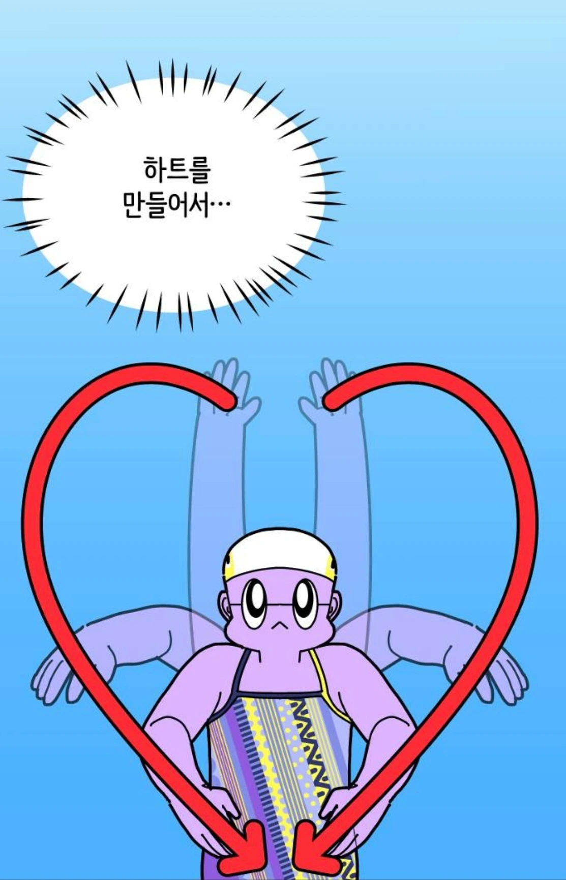 네이버 웹툰 <수영만화일기>에서 주인공이자 작가는 평영 스트로크에 대해 "하트를 그려 반으로 쪼개라"는 피드백을 받는다. 지난번 내가 평영을 두고 '열렬한 사랑고백 같다'라고 표현했을 때와는 다소 상반된 느낌이라 찬물이 끼얹힌 기분이지만, 그림으로 구현된 동작을 보니 그 또한 일리가 있다.