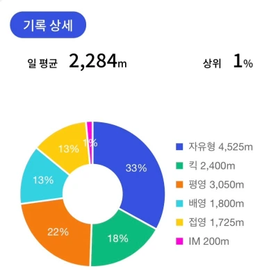 요즘은 공부한답시고 기록을 종종 누락하는데도 수영기록앱에서 상위 1%를 찍었다. 앱 사용자 한정이지만 뿌듯하다.