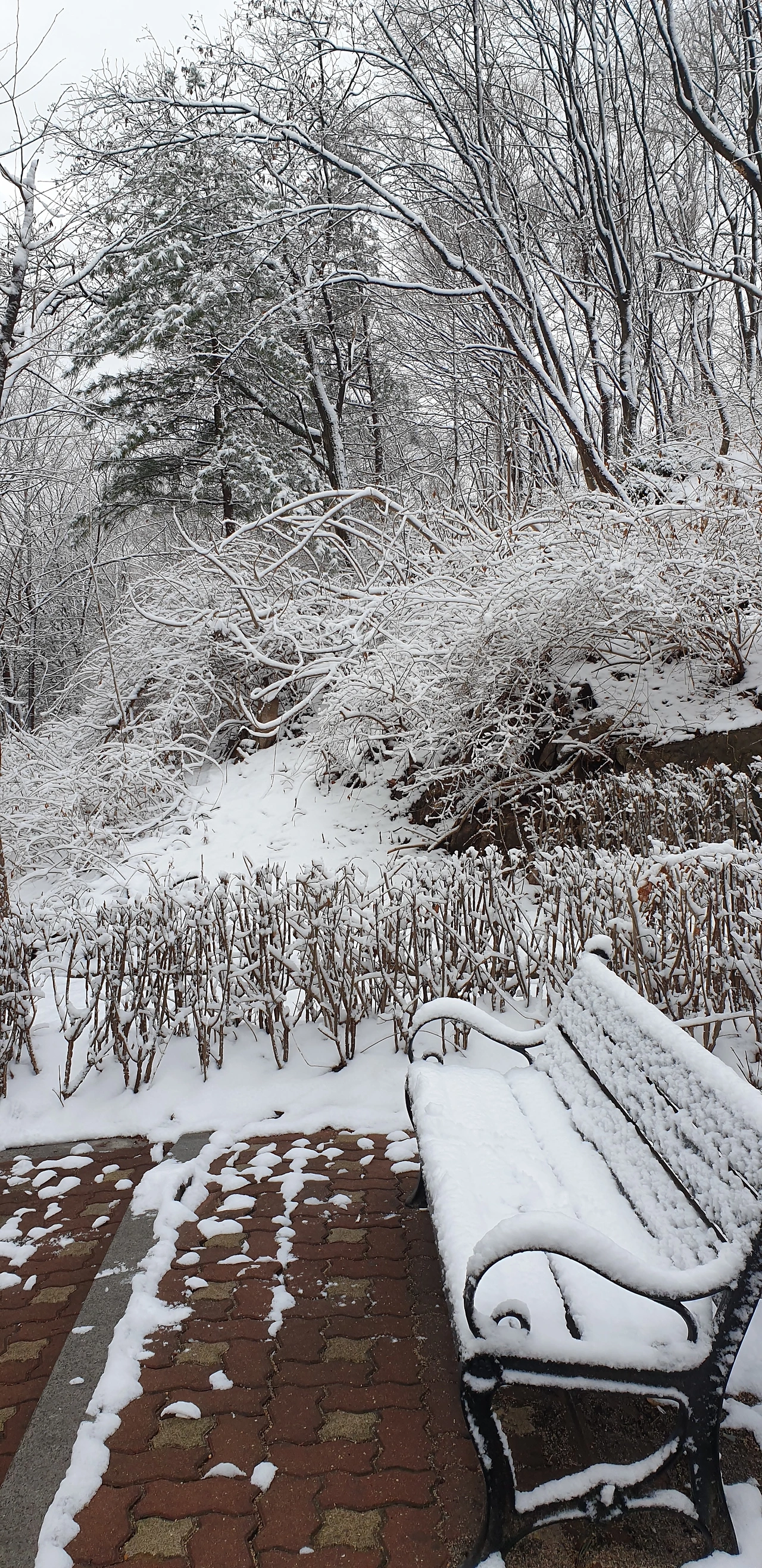 등교와 달리 내리막인 귀갓길은 버스를 타지 않았다. 소나무고 벚나무고 아파트고 메탈휀스고 눈은 가리지 않고 내려앉았다. 3월 풍경이 겹겹이 두른 하얀 옷을 자랑하는 동안 여기저기서 비질 소리가 돌림노래처럼 겹쳐울렸다. 열선이 깔린 차도와 달리 제설제가 안 뿌려진 경사진 인도는 걸음마다 미끄럽지만, 종종 지나는 사람마다 휴대폰 속에 눈 쌓인 풍경을 담아내기 바빴다.