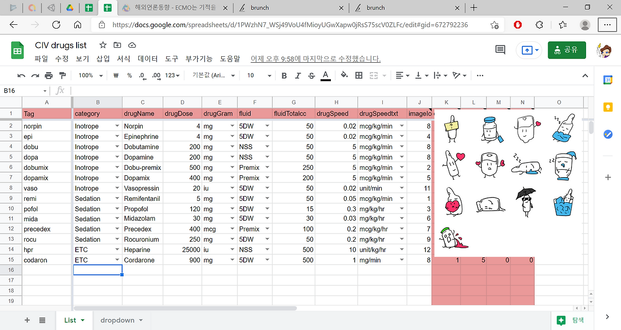 그리고는 약물 리스트를 일일이 개발툴에서 입력하는 건 유지보수 측면에서 무리수인 것 같아서 날잡아서 구글 시트로 정리해서 업데이트 하는 기능을 구현했다.