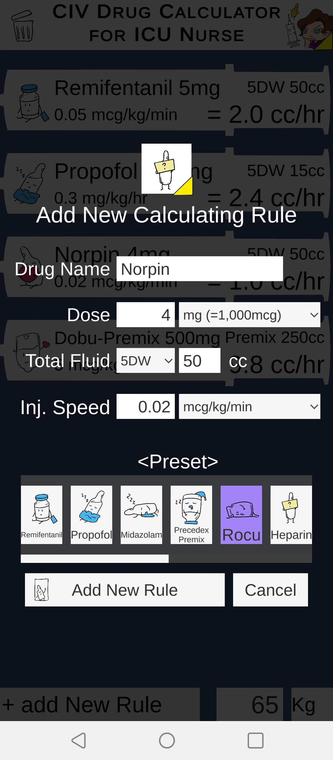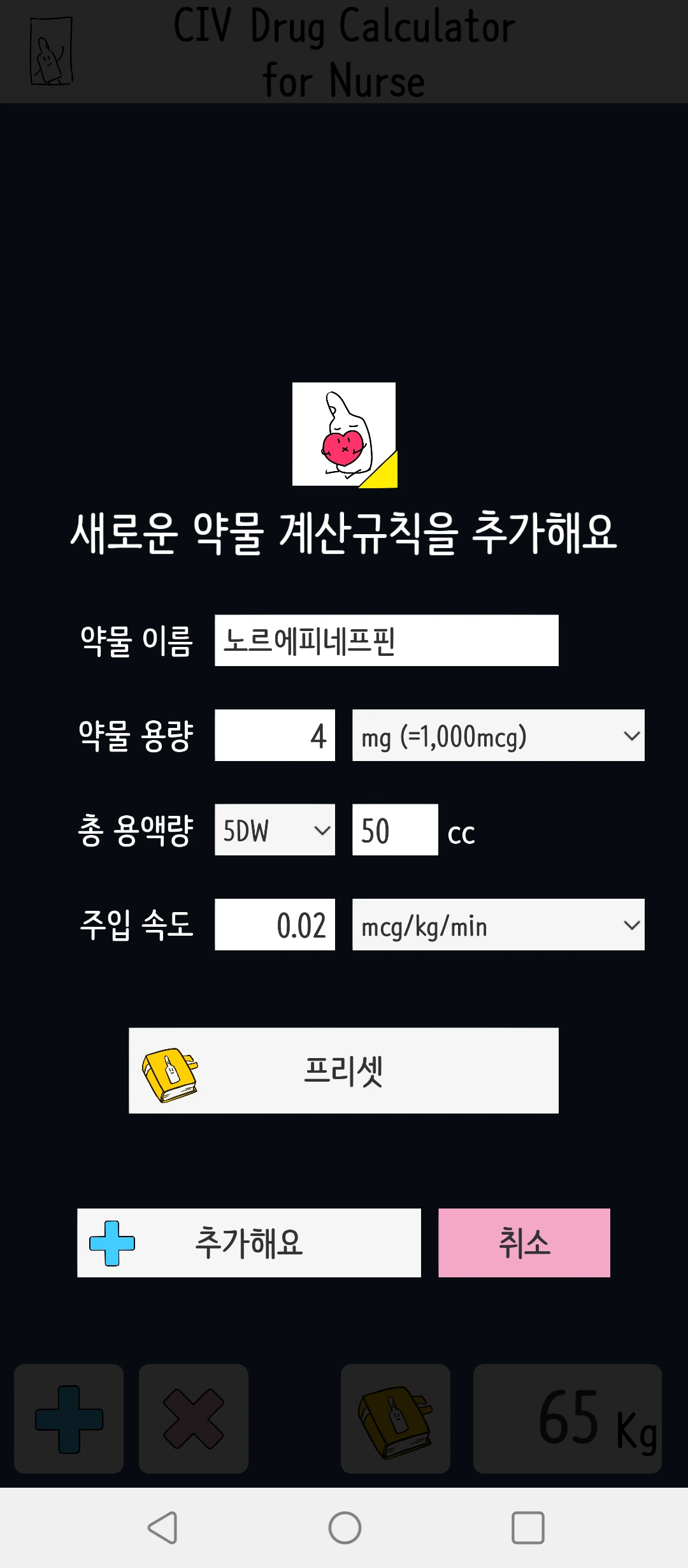 프리셋들은 내가 일하는 병원에서 자주 쓰는 약물들의 계산 위주로 적었는데 다른 병원에서 일하는 사람들은 희석용량이 다를테니 화면에 추가한 약물들의 희석용량이나 용법을 수정한 채 저장할 수 있도록 했다.