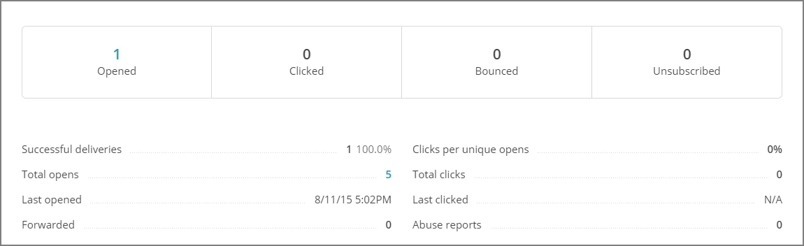 다음으로는 위와 같은 수치가 나오는데요. Opened와 Total opens의 차이를 설명드리면 Opened가 한 사람이 몇 번을 열어보았든 1번으로 카운팅하는 것이라면 Total opens은 말 그대로 오픈이라는 행위의 카운팅을 한 수치라고 생각하시면 됩니다.