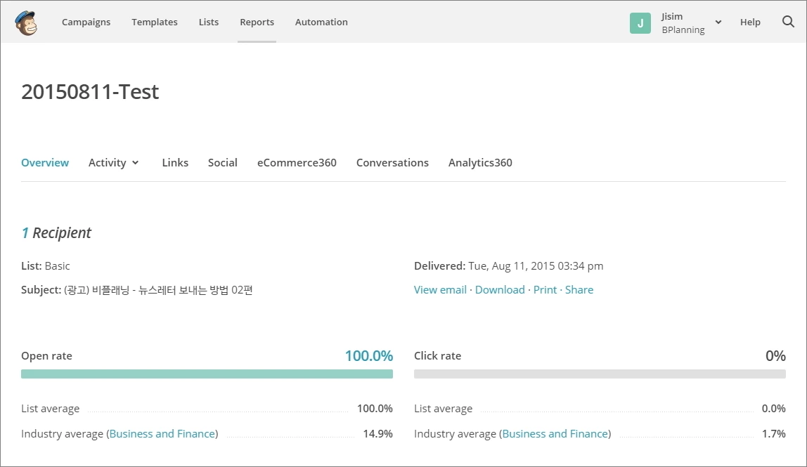 오픈율은 말 그래도 발송한 뉴스레터를 대상자 중 몇 % 가 열어보았냐입니다. 이 오픈율이 높을수록 고객들이 뉴스레터에 관심을 보였다는 증거가 되겠지요. 밑에 보시면 List average가 있는데 이것은 그동안 내가 보낸 뉴스레터의 평균적인 오픈율이 어떻게 되는지에 대한 정보입니다. 하나만 샘플로 보냈으니 두 개의 수치가 동일하지만 보통은 다르겠죠. 이럴 때 평균적으로 그동안의 수치가 어느 정도 나왔는데 이번에는 어떻게 나오고 있다를 비교하면서 오픈율에 대한 평가를 할 수 있습니다.