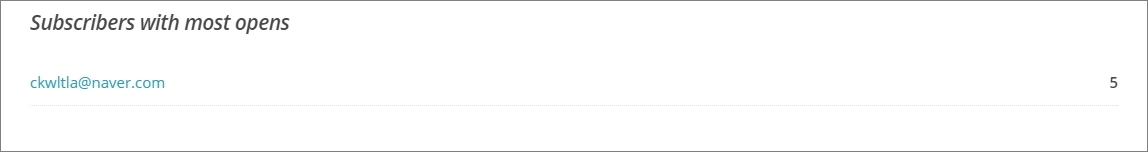 이 부분은 뉴스레터를 받은 사람 중 누가 가장 많이 오픈을 했는지 보여주는 기능입니다. 현재는 한 사람만 나오지만 받은 사람이 많은 경우 많이 열어본 순서대로 구독자가 몇 명 뜹니다. 우리 회사 서비스에 관심을 많이 갖는 고객을 파악할 수 있는 기능이죠.