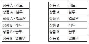 이 예시의 경우 두 가지 형태로 편집한 사항인데, 왼쪽의 형태처럼 한 셀 안에 상품명의 정보와 옵션의 정보가 모두 있는 경우는 상품 A가 얼마나 팔렸는지 팡가 하기 위해 별도의 작업이 추가로 필요하게 된다는 것입니다. 오른쪽 예시처럼 한 열에는 상품 A, 상품 B와 같은 상품명을, 다른 한 열에는 레드, 블루 등과 같은 옵션을 입력할 경우 상품 A가 얼마나 팔렸는지, 상품 A의 레드가 얼마나 팔렸는지, 레드 색상이 얼마나 팔렸는지 등 각각의 조합에 따른 분석이 다양하게 가능하게 됩니다.