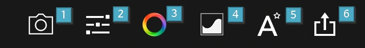 2번은 자르기, 회전, 노출, 선명도 등 다양한 기능들이 있어서 임의로 수정이 필요한 사진을 수정할 수 있어 편리하다. 4번은 얼굴 성형, 피부 보정 등과 같은 인물 보정 기능과 커브, 레벨 등을 수정하는 기능이 있다. 5번은 글씨를 쓰거나 스티커를 붙이거나 하는 등 사진을 꾸밀 수 있는 기능 위주이고 6번은 찍은 사진을 카메라롤에 저장하거나 인스타그램, 카카오스토리, 페이스북 등의 SNS로 보낼 수 있는 기능이다. 보통 사진편집앱 중 유명한 앱들이 외국의 것이 많아 카카오스토리로 보내는 기능은 없는데 국산앱이라 카카오스토리로 보내는 기능도 있어 편리하다.