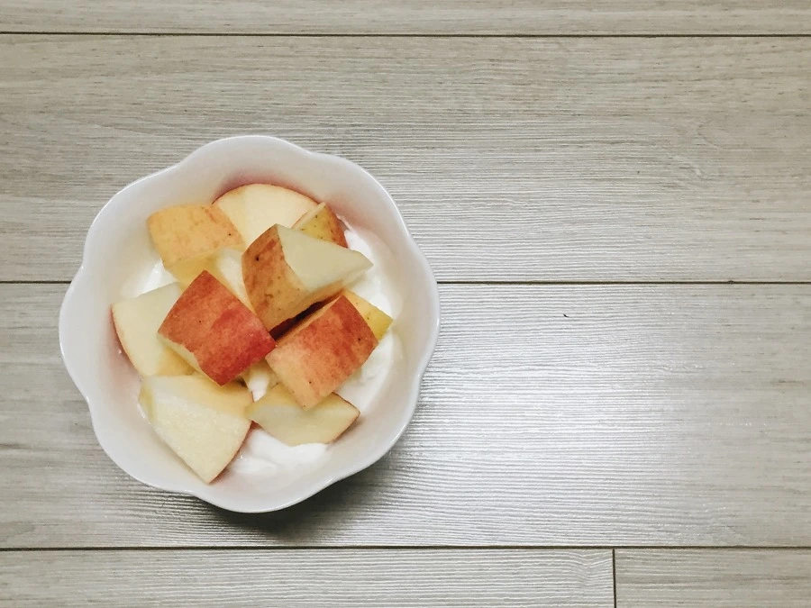 저는 아래와 같이 주로 사과 1/2~1개를 썰어 같이 먹어 주는데요. 가끔은 블루베리도 넣어주긴 하는데 블루베리가 칼로리가 좀 있어 대체로는 사과를 넣습니다.