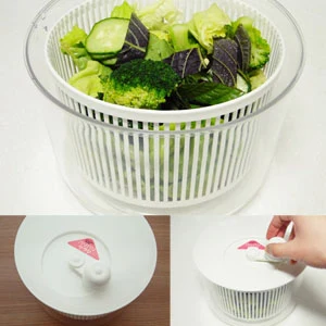 야채탈수기를 처음 들어보시는 분들도 계시죠? 아래와 같이 생긴 제품인데요. 보시는 것처럼 안쪽은 채반이고 위로 손잡이가 있어서 야채를 놓고 손잡이를 돌리면 안에 채반이 돌면서 야채에 있는 물기가 싹 빠지는 제품이에요.