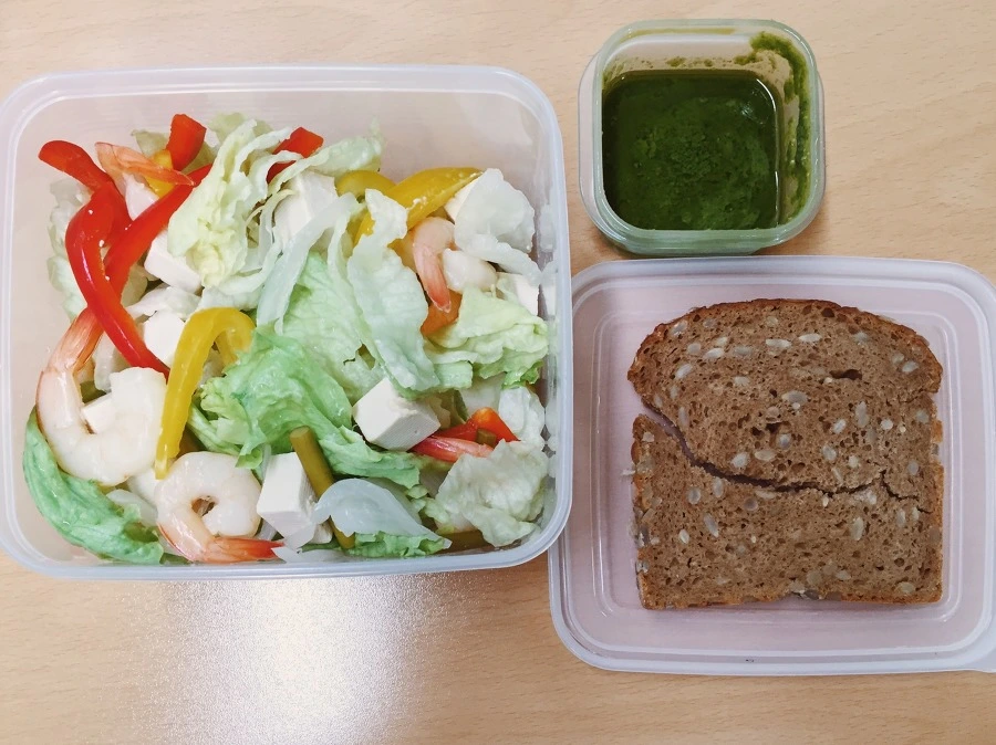 이렇게 소분해놓은 샐러드 야채에 닭가슴살이나 두부 등의 단백질 더하고, 한 번에 2-3일 치 만들어 소분에 놓은 드레싱 들고, 냉동해놓은 빵 아침에 꺼내 오면 한 끼 식사 준비로 완벽해요~ 아래 사진처럼요. 제가 오늘 점심에 먹은 도시락이에요..ㅋ