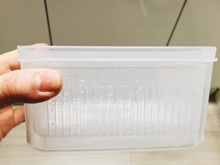 아래 사진이 위에서 야채탈수기로 탈탈 물기 턴 후 소분해놓은 야채의 모습이에요. 왼쪽에서 보시는 대로 통 자체에 채반이 있어 아주 편리한 통입니다. 사이즈로 제 기준으로 한 끼 분량의 샐러드 야채 넣기에 딱 좋고요.