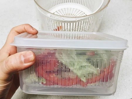 이렇게 두 가지 방법만 사용해도 야채를 그냥 보관하는 것보다 훨씬 오래 보관할 수 있고 샐러드에 물기가 거의 없다 보니 아주 적은 양의 드레싱으로도 맛있는 샐러드를 먹을 수 있는 장점도 있어요.