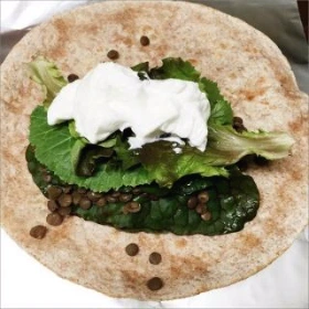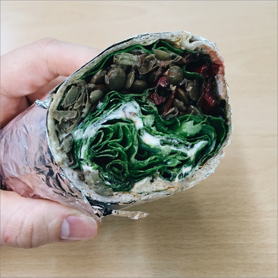 사실 이 순서는 그다지 중요하지는 않아요. 어차피 마는 거라... 다만 경험상 그릭요거트와 칠리소스 위에 야채를 살짝 덮어주시는 것이 말 때 손에 안 묻고 좋아요.