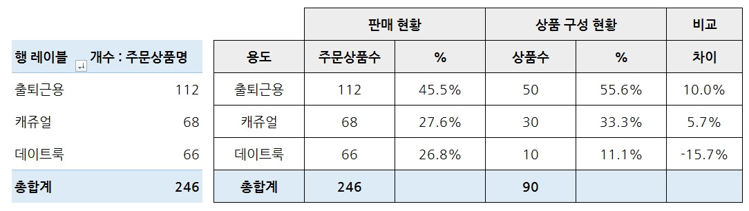 의류 쇼핑몰을 예시로 위와 같은 결과가 나왔다면 자사 사이트를 주로 이용하는 고객들은 출퇴근용 복장으로 분류되는 옷을 구매하는 비중이 높다는 것을 알 수 있습니다. 그리고 캐쥬얼과 데이트룩은 거의 비슷한 비율을 보이고 있죠. 근데 실제 상품 구성 현황과 비교를 해보면 데이트룩이 상품 구성은 적은데도 많이 팔린 것을 확인할 수 있습니다. 이와 같은 경우 의사결정의 문제이지만 데이트룩의 상품 구성 비율을 올린다면 추가적인 판매가 더 일어날 가능성이 있겠죠.