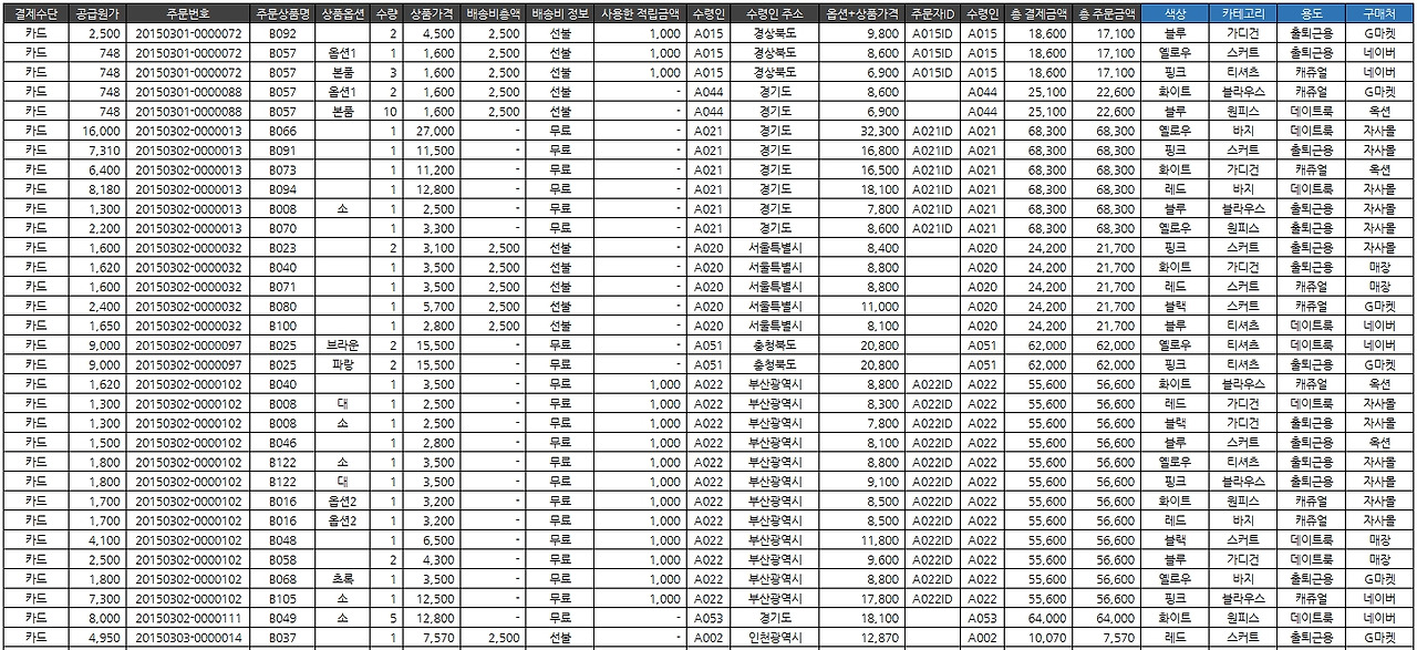 이렇게 상품이나 주문자들의 특성에 따라 분석을 하게 되면 이후 전략을 어떤 식으로 전개할지 볼 수 있게 되므로 매출을 단순히 합계 위주로 분석하지 말고 이와 같이 여러 가지 항목별로 분석해보는 것이 필요합니다.