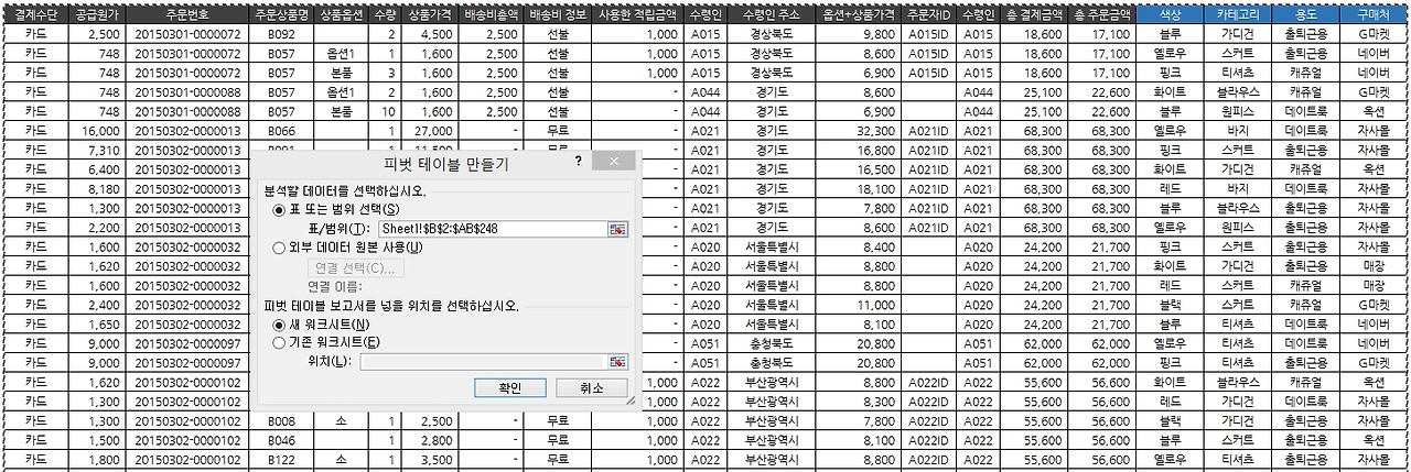 분석하고자 하는 데이터가 있는 셀에서 피벗 테이블 만들기를 클릭하면 상기와 같이 나오고 분석을 원하는 영역이 잘 선택되었다면 확인을 누르시면 됩니다. 상기 이미지에서 테이블 주변으로 점선이 보이실텐데 이 영역이 분석을 하겠다고 선택된 영역이라고 보시면 됩니다.
