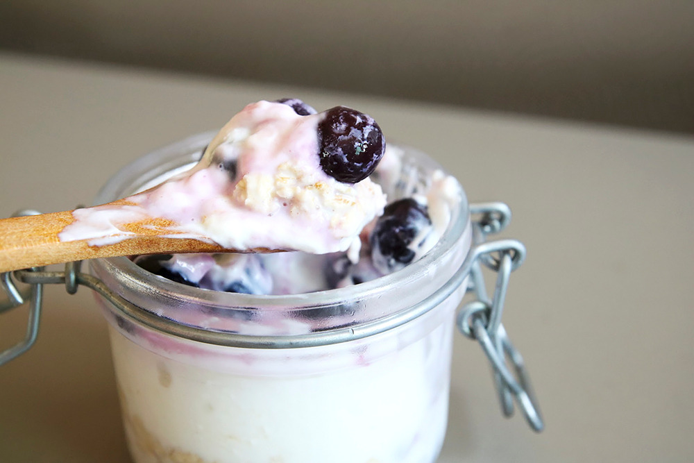 오트밀 20g, 저지방 우유 또는 두유 40g, 플레인 요거트 또는 그릭 요거트 100g, 블루베리 등의 과일 40g