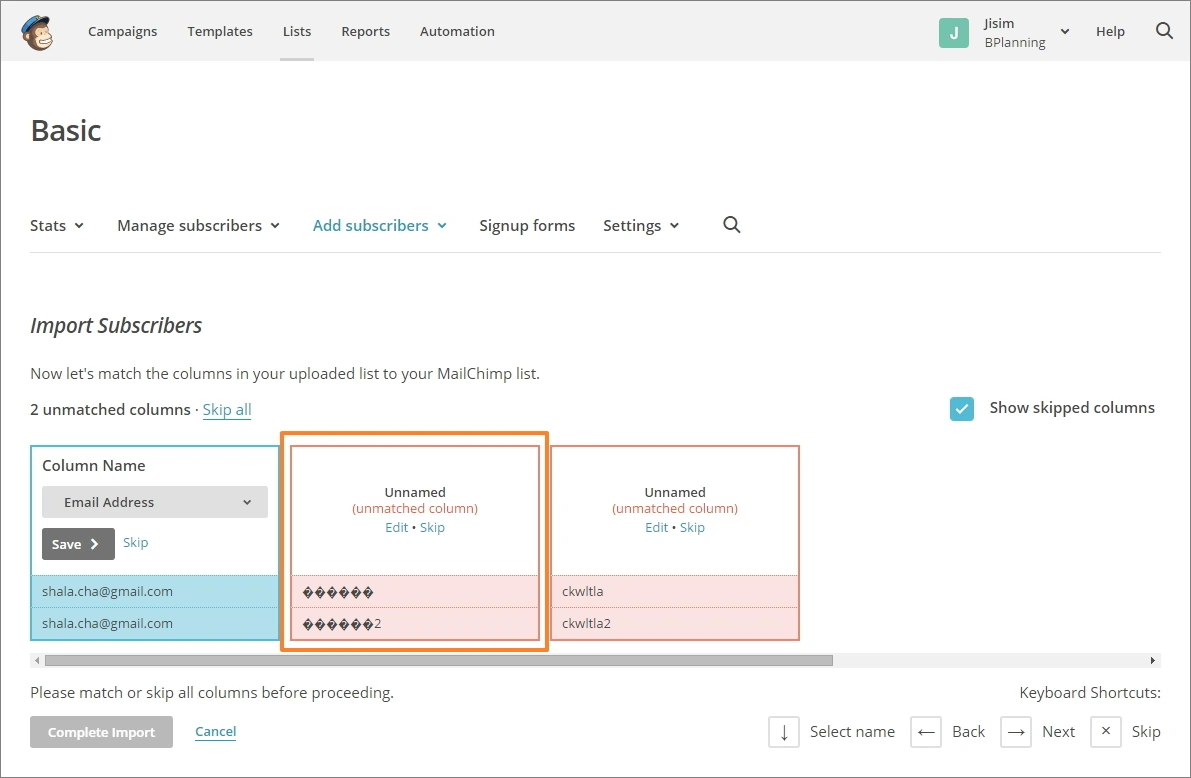 그렇게 되면 아래 이미지와 같이 해당 파일에 있는 내용들이 나오면서 해당 열별로 어떤 항목인지 설정하는 화면이 나옵니다. 이메일과 같이 식별이 가능한 항목은 Email Address라고 설정이 되니 Save 버튼만 눌러주면 되고 그렇게 기본 설정이 안 되는 항목은 각자 원하는 항목으로 설정을 한 후 Save를 눌러주면 됩니다 (반드시 설정 후에는 Save를 눌러줘야 설정이 됩니다). 다만, 파일에 정보가 있긴 했으나 굳이 리스트에 추가하지 않아도 되는 정보는 Skip을 클릭하면 됩니다.