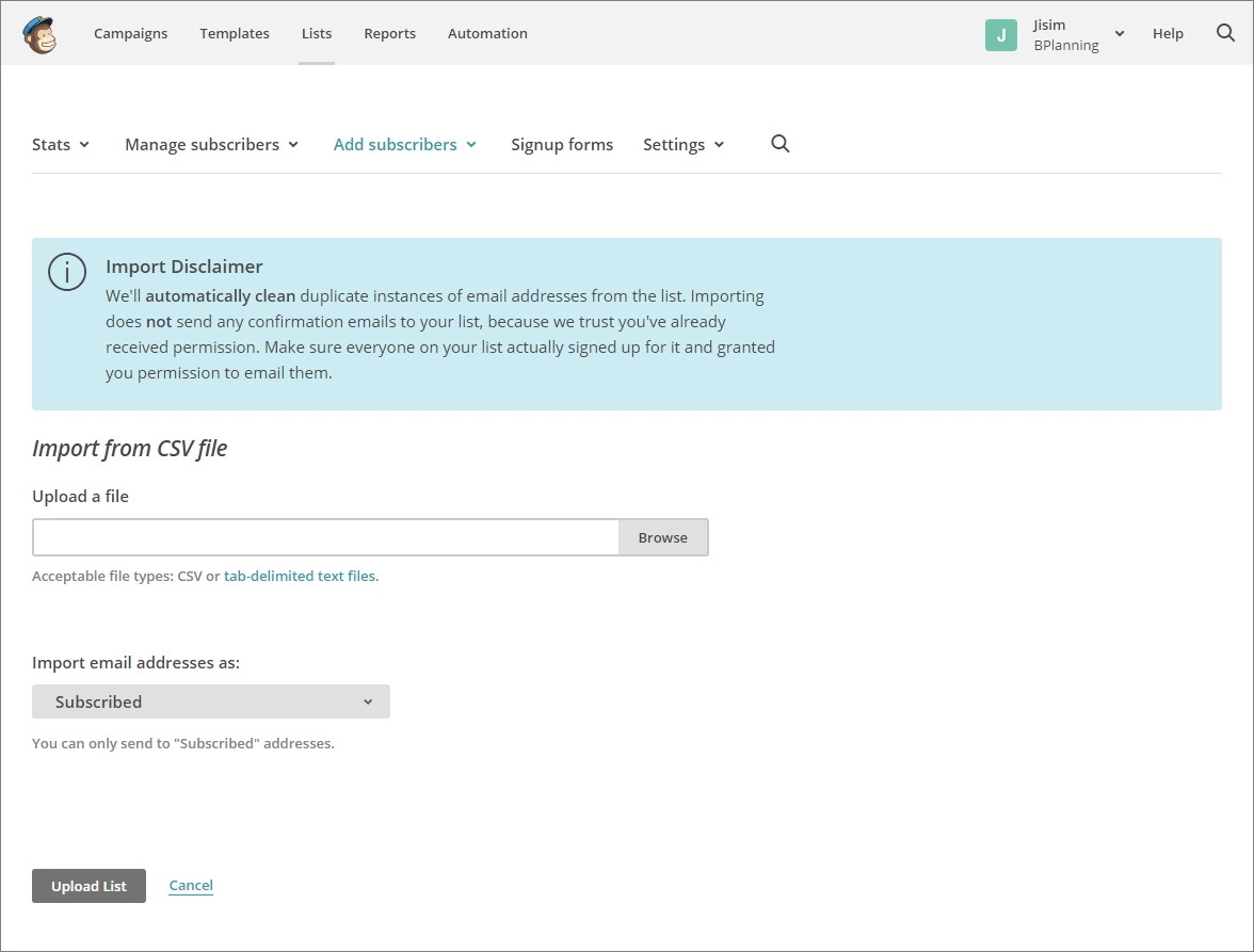 해당 메뉴를 클릭하면 아래와 같이 파일을 업로드할 수 있는 화면이 나오고 'Browse'를 클릭해서 CSV 파일 또는 TXT 파일을 찾아 'Upload List'를 클릭하면 됩니다 (수신동의를 한 고객 리스트만 파일에 정리한 후 이렇게 누르면 됩니다).