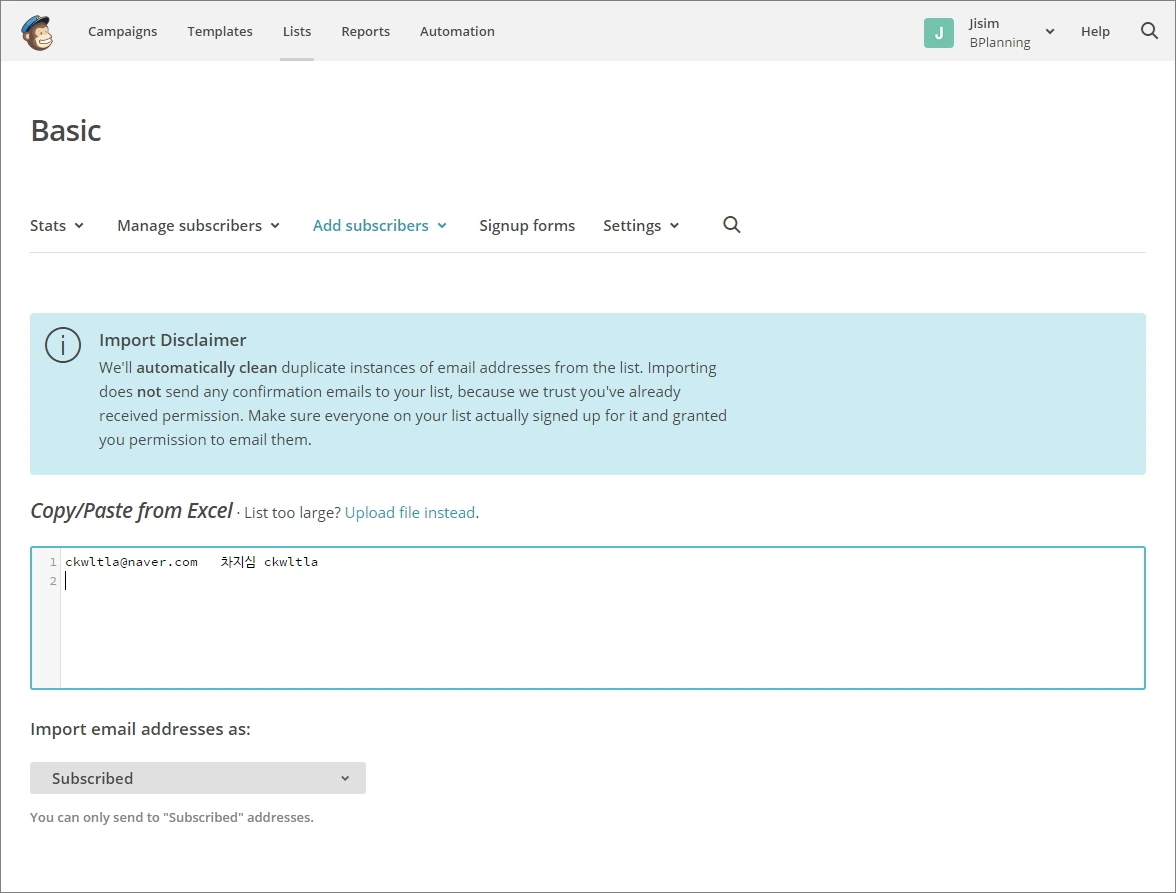 이렇게 리스트를 생성하고 나면 구독자를 추가해야 하는데 방법은 개별적으로 하나씩 올리는 방법, 구독자 리스트를 파일로 한꺼번에 올리는 방법, 구독자 리스트를 붙여 넣기 하여 올리는 방법 등이 있습니다.