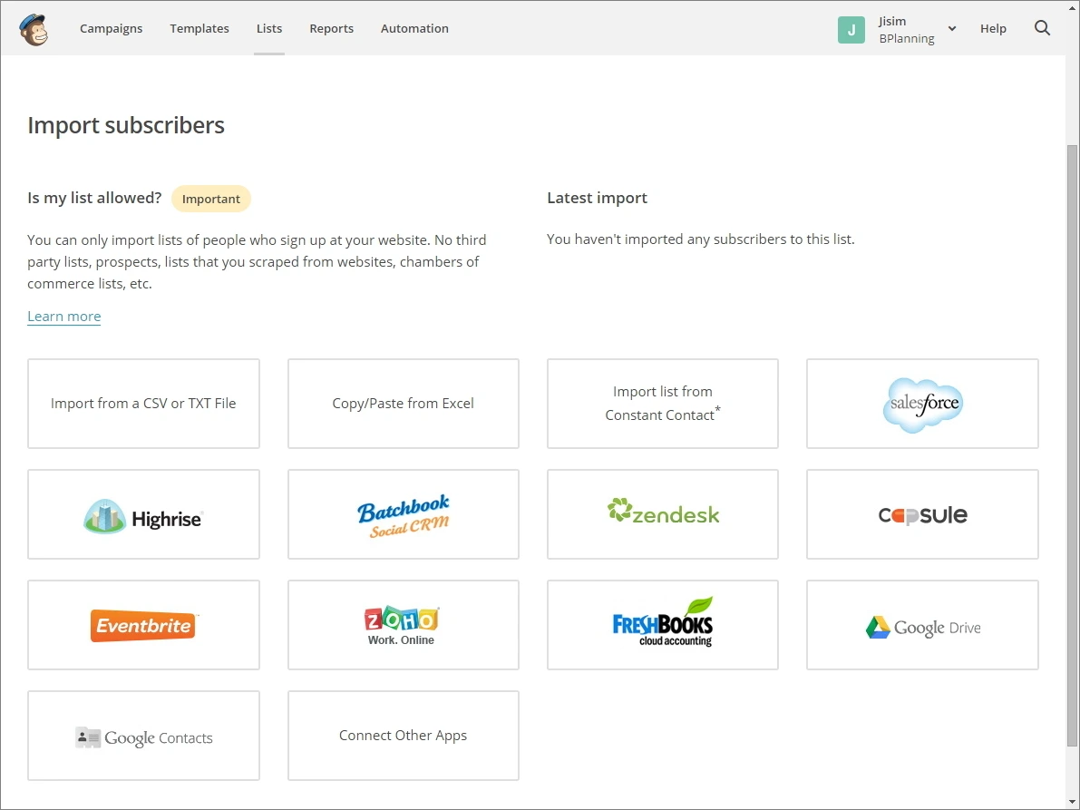 CSV 파일, 탭으로 구분된 TXT 파일로 가지고 있을 경우 한꺼번에 파일로 올릴 수 있습니다. 보통 쇼핑몰툴에서 회원 정보를 CSV 파일로 제공하므로 해당 기능을 이용하여 파일을 다운받아 여기에 올리면 됩니다. List 메뉴에서 Add subscribers > Import subscribers을 클릭하면 아래 화면이 나오고 이 중 'Import from a CSV or TXT File'을 클릭하면 됩니다.