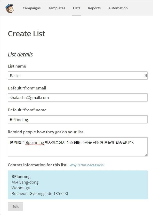 이렇게 간단하게 회원 가입하는 방법과 리스트를 생성하는 방법을 설명하였고, 다음 편에는 템플릿을 이용하여 실제 뉴스레터를 제작하는 방법에 대해서 설명하도록 할 예정입니다.