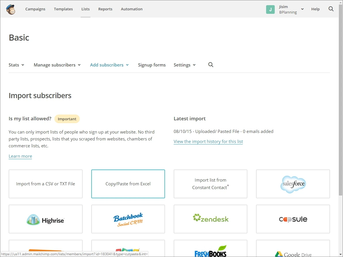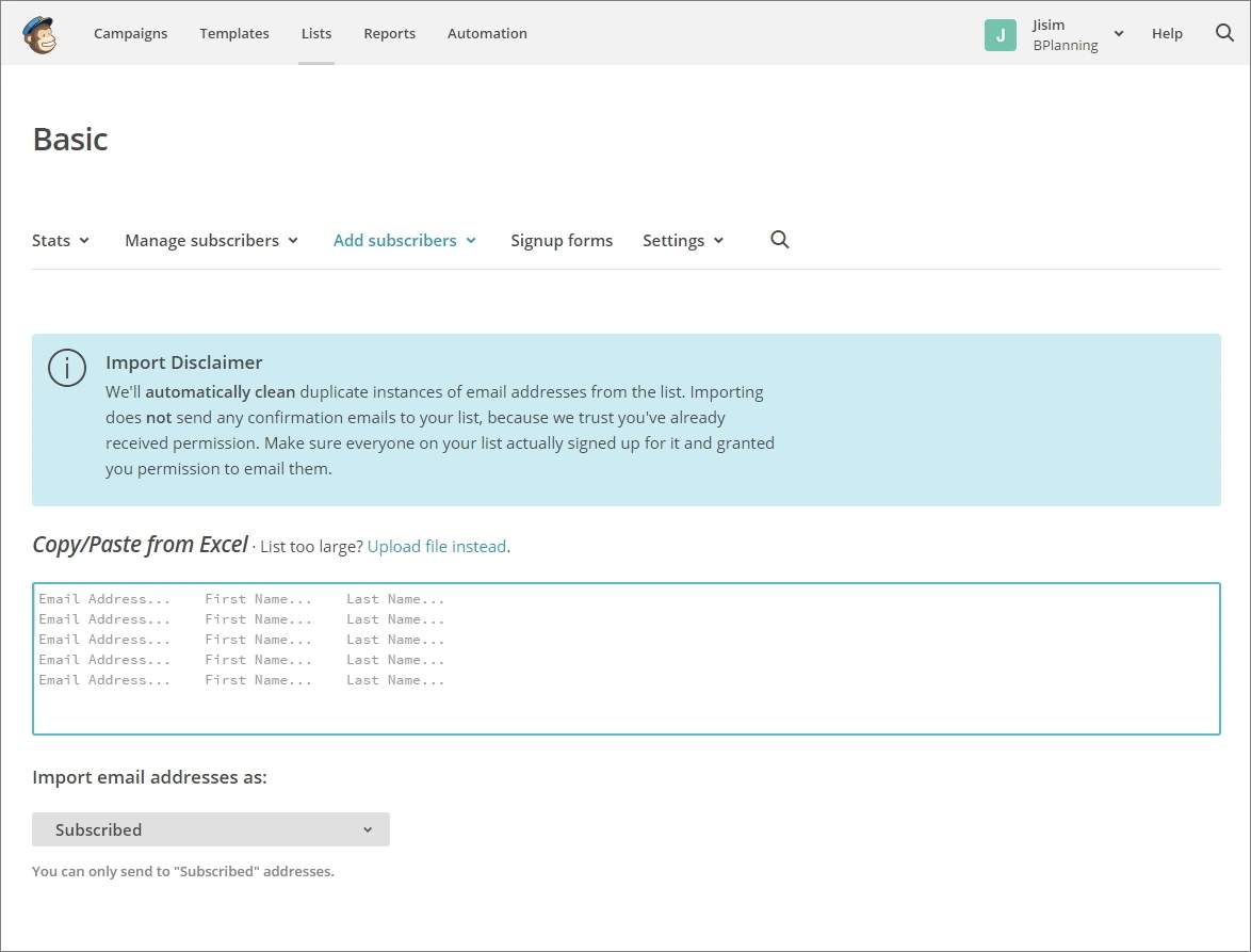이 방법은 상기에서 설명한 것처럼 한글이 포함된 리스트를 올릴 때 사용하면 오류 없이 한꺼번에 많은 리스트를 올릴 수 있어 편리합니다. 다만, 디폴트로 Email, First Name, Last Name으로만 항목을 세팅해주기 때문에 붙여 넣기 하기 전에 Settings > List fields and *|MERGE|* tags으로 들어가서 항목을 추가한 후 붙여넣기 하면 됩니다.