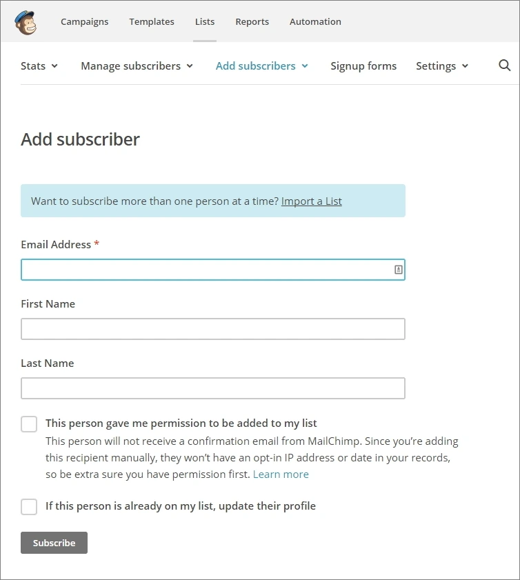 List 메뉴에서 Add subscribers > Add a subscribers을 클릭해서 들어가면 개별적으로 하나씩 올릴 수 있는 화면이 나옵니다 (아래 이미지 참조). 다만, 이렇게 하나씩 올리는 것은 누락된 구독자를 올리거나 하는 등 특수한 경우에만 사용하게 되는 사항으로 자주 이용하지는 않습니다.
