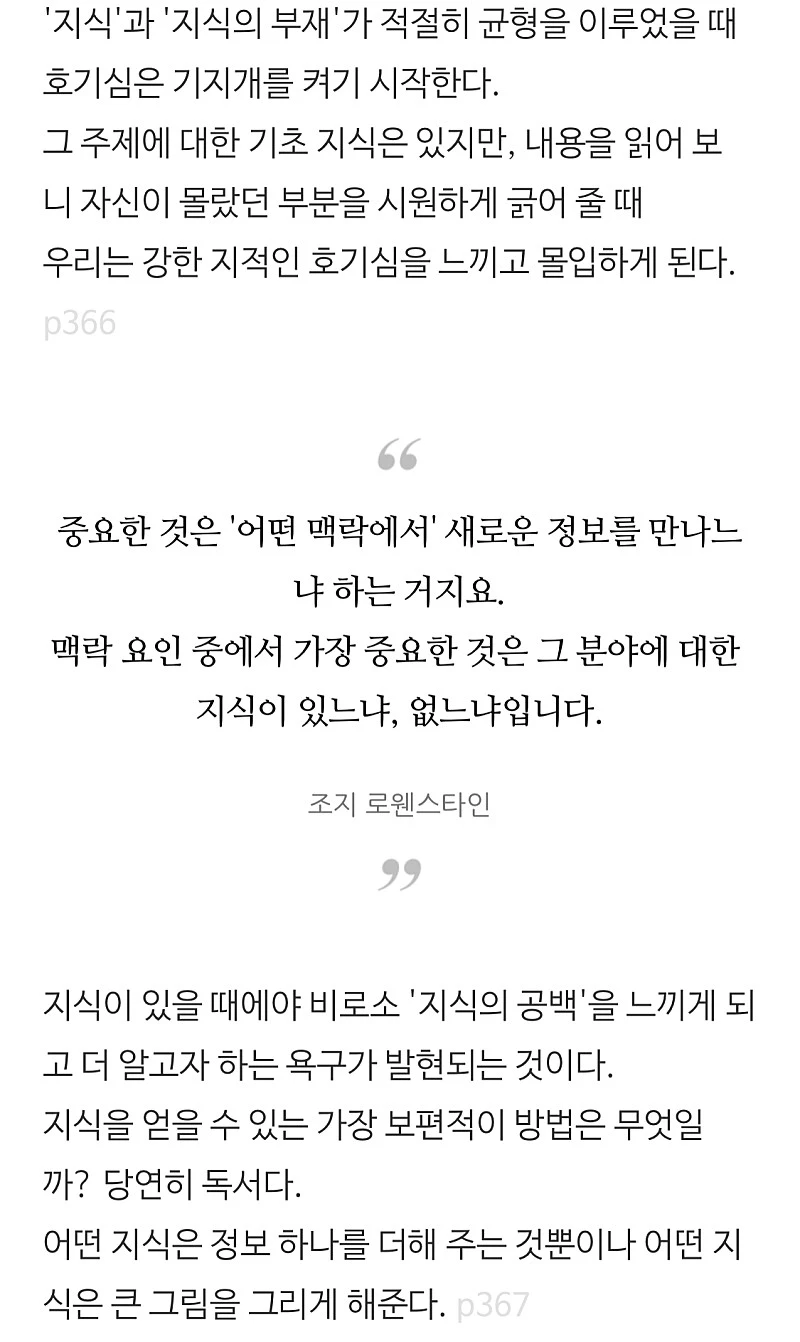 위에서 언급한 지적 호기심 때문에 오랜만에 다시 읽어본 『완벽한 공부법』 서평. 지식이 있을 때에야 비로소 지식의 공백을 느낄 수 있다는 말. 너무 좋다!