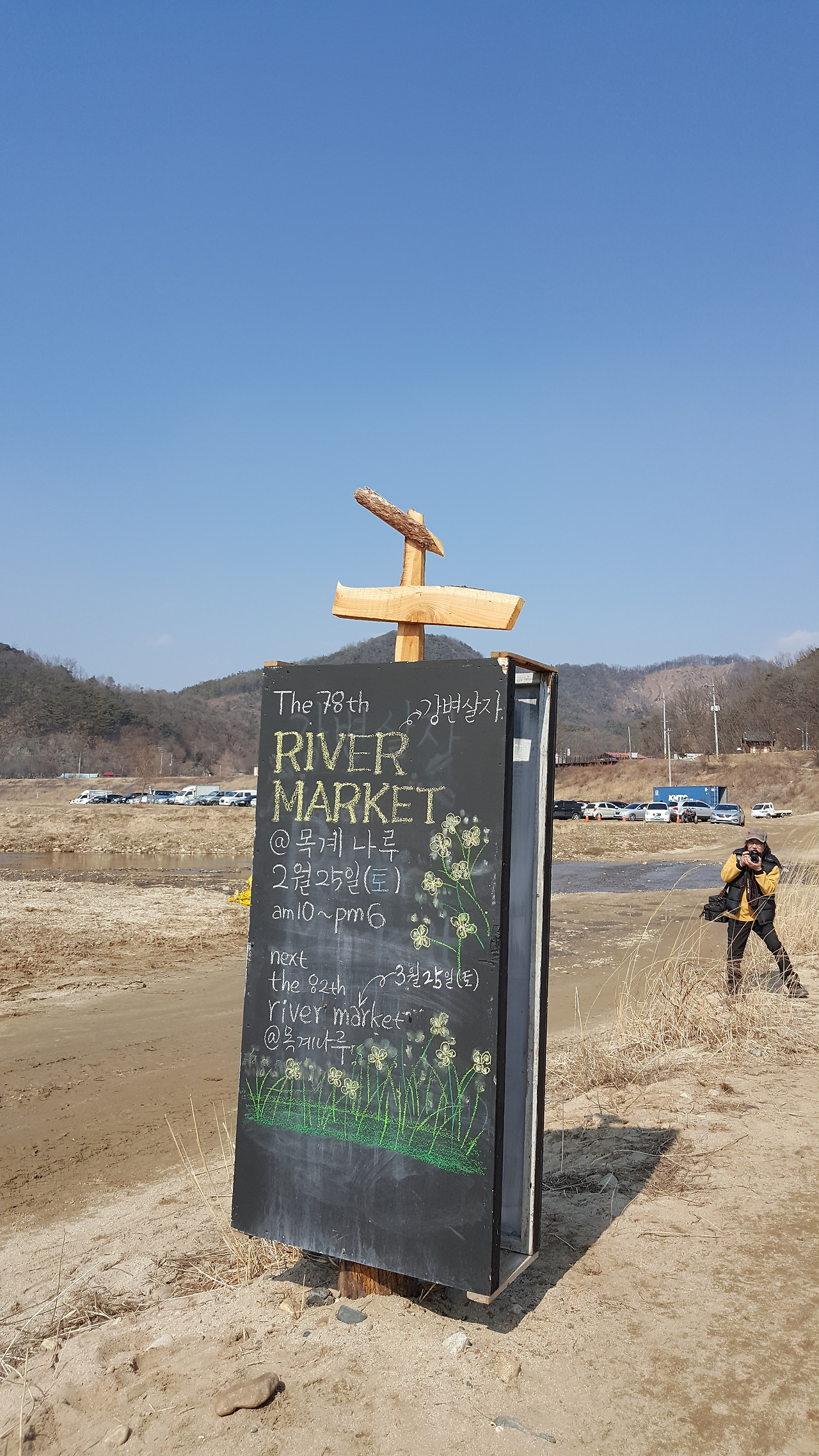 목계 (牧溪) 나루다. 물길을 길러낸다는 뜻인가? 수 백 미터 넘을 너른 강역은 물길을 길러내는 공간으로 제격이다. 크고 작은 물길이 봄볕에 풀어지며 어울려 흐른다. 물 비늘 가득한 큰 강 곁으로 조용한 물길이 각을 이루며 연결되어 있고, 그 양편에 두툼한 둔덕이 완만하게 펼쳐지다가 꼬리를 들어 강둑 차도로 이어진다. 둔덕을 따라 무수한 발길을 추억하는 크고 작은 돌들이 꿈꾸듯 누워 있다. 몇 마리 물새가 가벼운 바람을 타고 내린다.