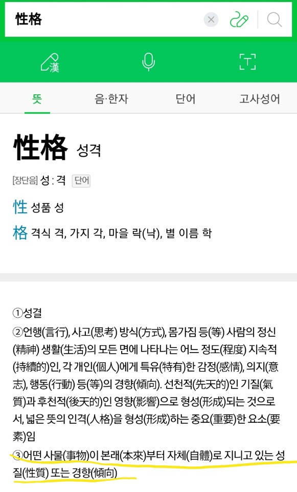 '성격'의 성은 마음心과 날生으로 만들어져, 태어날 때부터 가지고 태어난 기질이나 성질에 기반된 것이다.