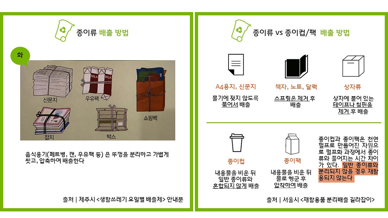 또한, 재활용품의 한 제품군인 종이팩은 잘못된 분리배출로 재활용률이 전국적으로 26%밖에 안된다고 한다. 타지차체에서 회수율을 높이기에 위해 양에 따라 롤 휴지로 교환해주는 사업을 진행하고 있으며, 제주에는 이를 활용하는 업체조차 없어 서귀포시에서 종이팩 재활용 지원사업을 작년부터 시작했다. 종이팩(컵)은 일반 종이류와 분리 배출되어야 재활용이 되는 것이 핵심이다.