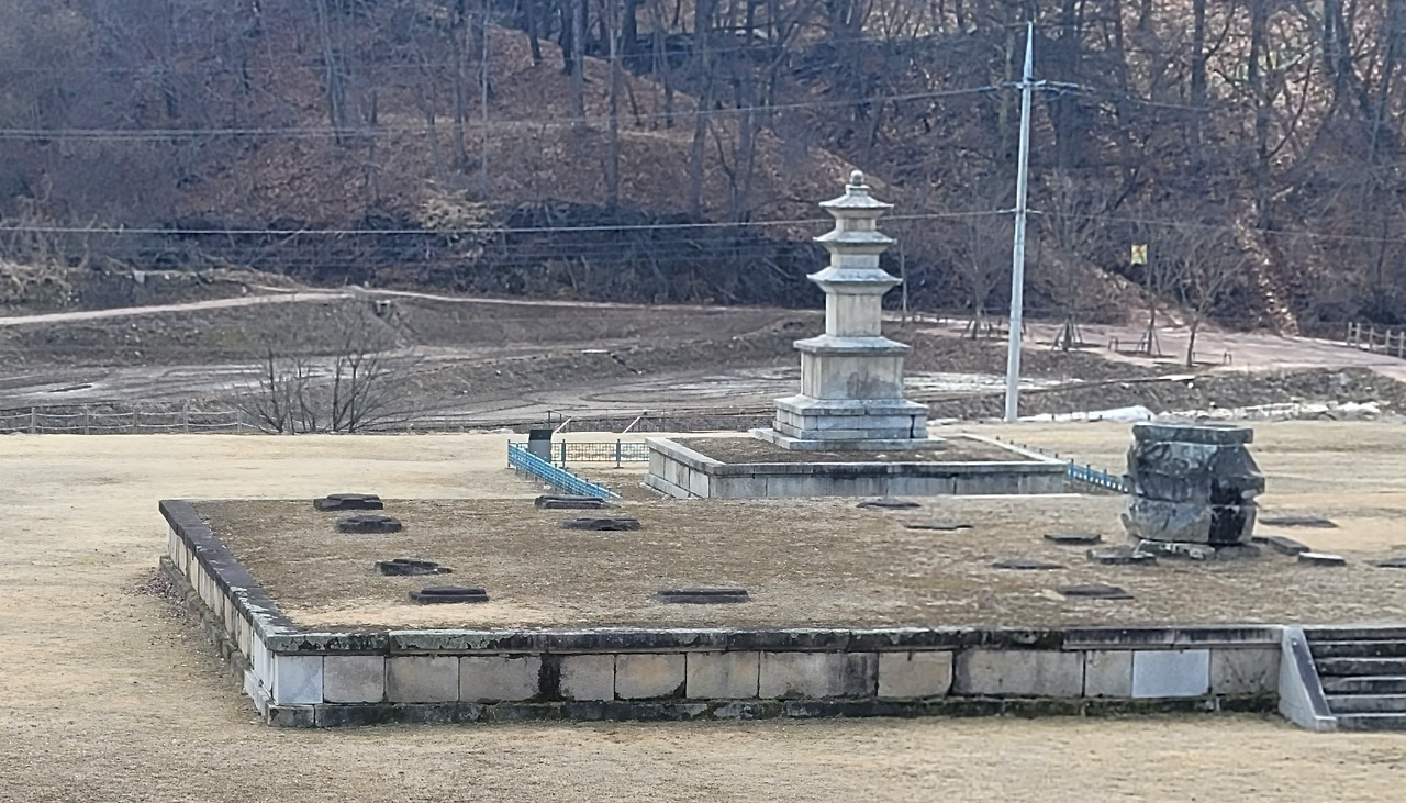 그저 한참 있다가 답사객은 상상으로 텅 빈 것을 채운다. 3층석탑 뒤로 부처님을 모신 금당이 있었을 것이다. 금당 중앙에 있는 큰 돌덩이 같은 저곳에 부처님이 앉아 계셨을 것이다. 크기로 보아 부처님의 크기는 이만했을 것이고, 그 불상의 크기로 금당의 크기는 또 이만했을 것 같다는 상상. 그때 차를 세웠던 정산분교에서 봤던 당간지주가 아주 컸던 것까지 기억을 합친다.
