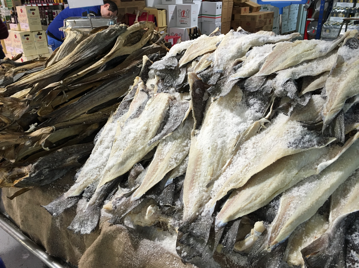 사진은 독일 프랑크푸르트 제일의 수산시장이자 이탈리아 식재료 시장인 Venos의 염장 건조 대구의 모습입니다. 눈처럼 덮힌 소금과 나무 몽둥이만큼 딱딱한 모습을 보면, 저걸 먹을 수 있나 싶기도 하지만 반대로 이 정도로 건조시켰기 때문에 이탈리아 스페인 포르투갈 등 더운 나라에서도 보관이 가능했던 것입니다. 이탈리아에서는 바칼라(Baccala), 스페인에서는 바칼라오(Bacalao), 포르투갈에서는 바칼라우(Bacallau)라고 부르는데 다 대동소이 합니다.