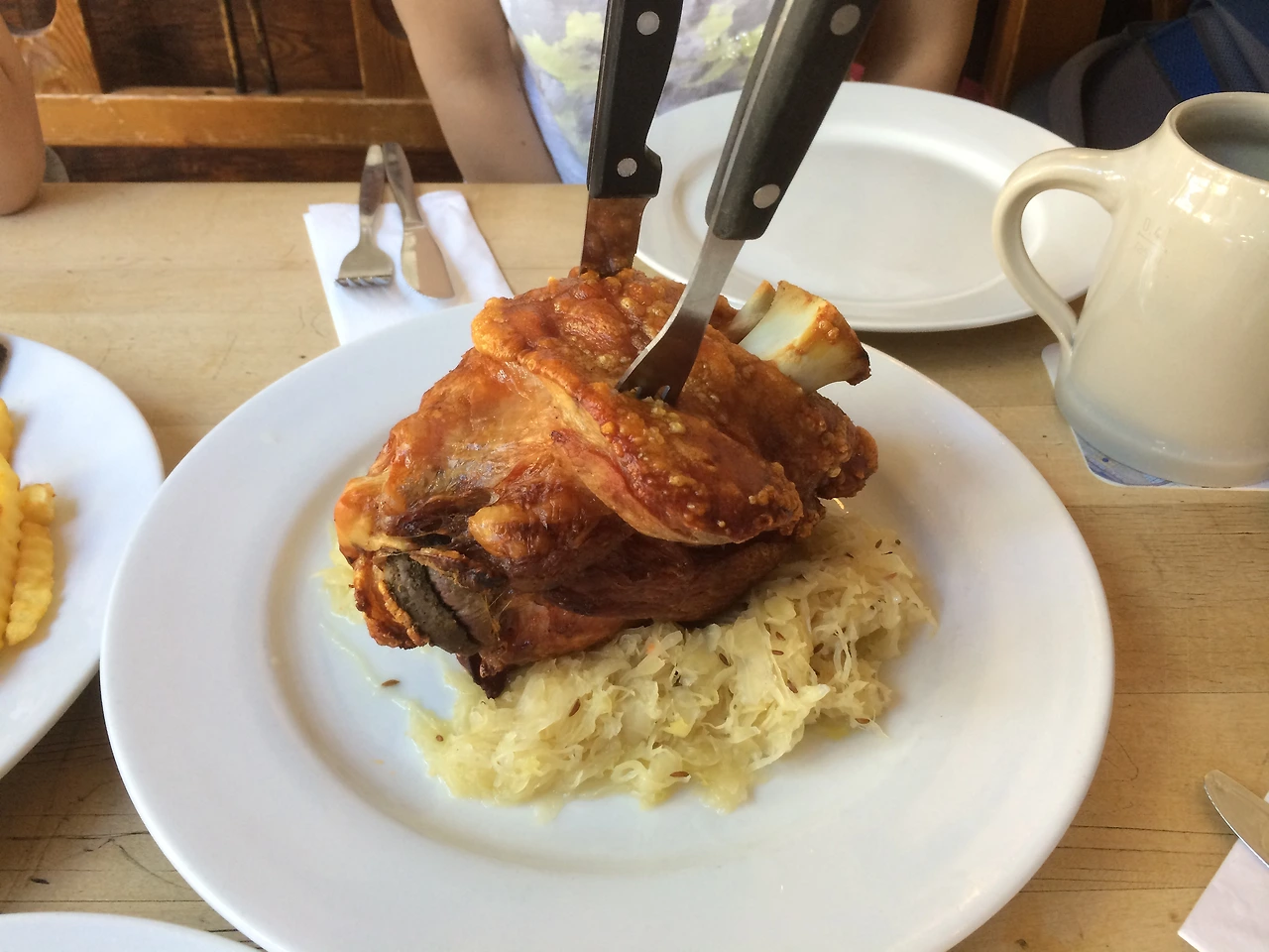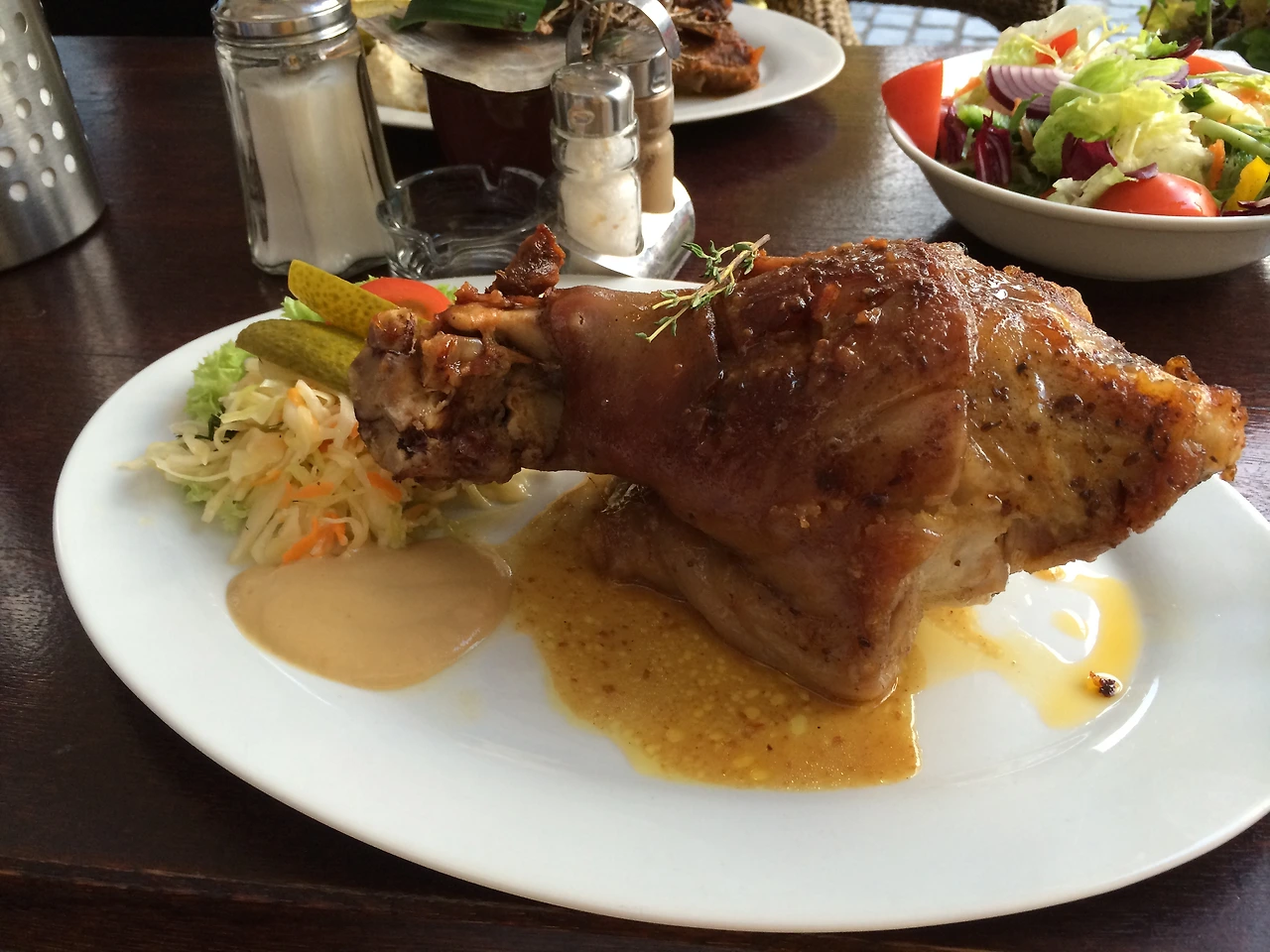 맥주에 삶아서 속은 보드랍고, 소스를 발라가며 오븐에 구우면서 겉을 바삭하게 만듭니다. 겉 껍질의 바삭함과 속살의 보드라움을 동시에 즐기는 요리로 우리 기준으로는 양이 상당하나 독일인들은 인당 하나씩 맥주와 함께 즐겨먹습니다. 보통 양배추 초절임인 샤워 크라우트와 함께 제공되는데 다소 느끼하게 느껴질 때 치킨에 무처럼 궁합이 좋습니다.