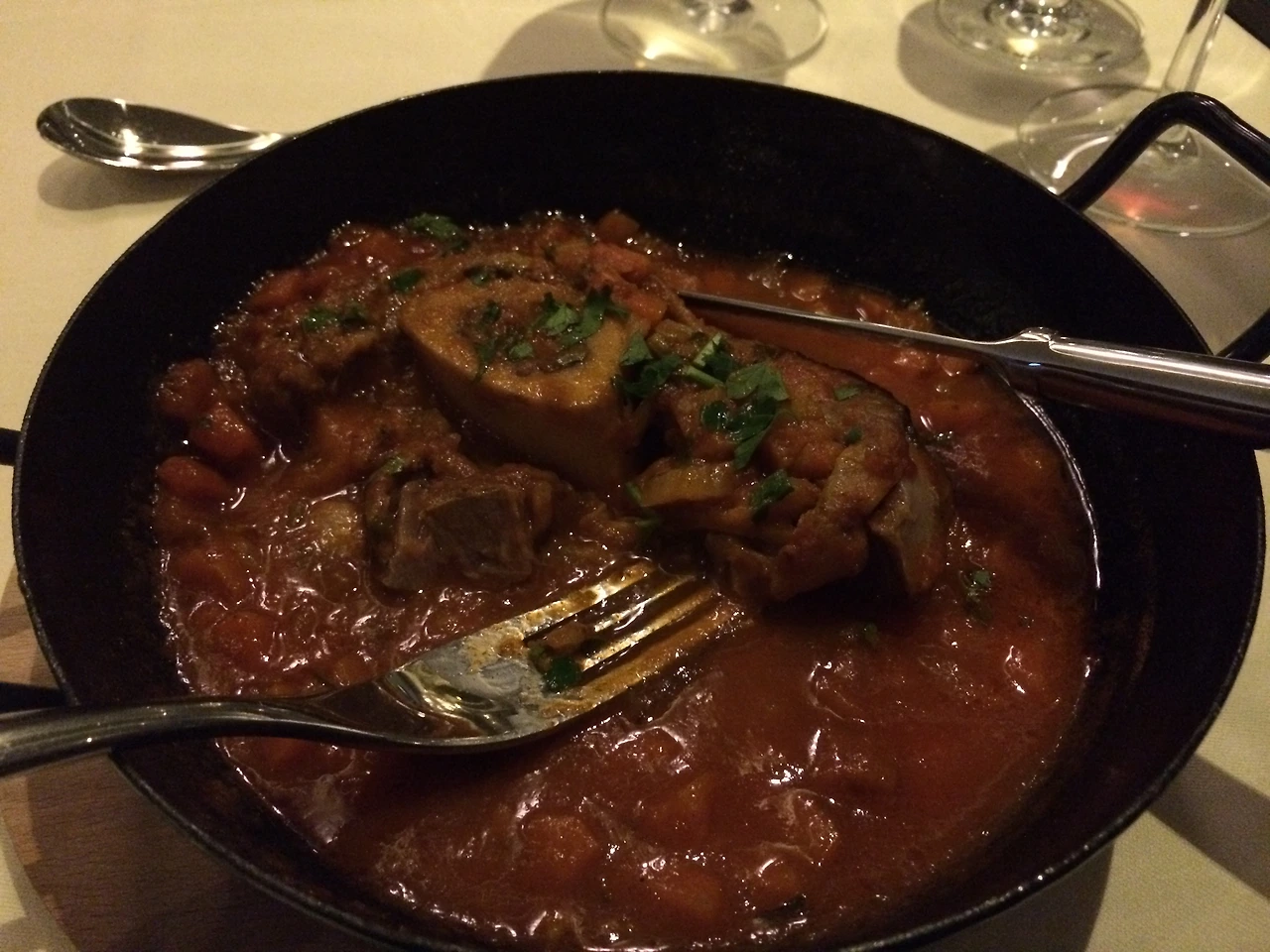 뼈 얘기가 나온 김에 이탈리아의 뼈요리를 소개하자면, 주로 밀라노를 중심으로 북부 이탈리아에서 유명한 오소부꼬(Ossobuco)가 있습니다. 오소(Osso)는 뼈, 부꼬(Buco)는 속이 비었다는 뜻입니다. 즉 송아지의 정강이 뼈를 골수가 다 녹아나와 속이 비도록 만드는 요리입니다. 샤프란으로 만든 노란 리조토 알 밀라네제를 곁들입니다. 이러한 전통적인 레서피외에도 최근에는 토마토 소스를 넣은 오소부꼬 알 뽀모도르(Ossobuco al Pomodoro)도 많이 먹습니다.