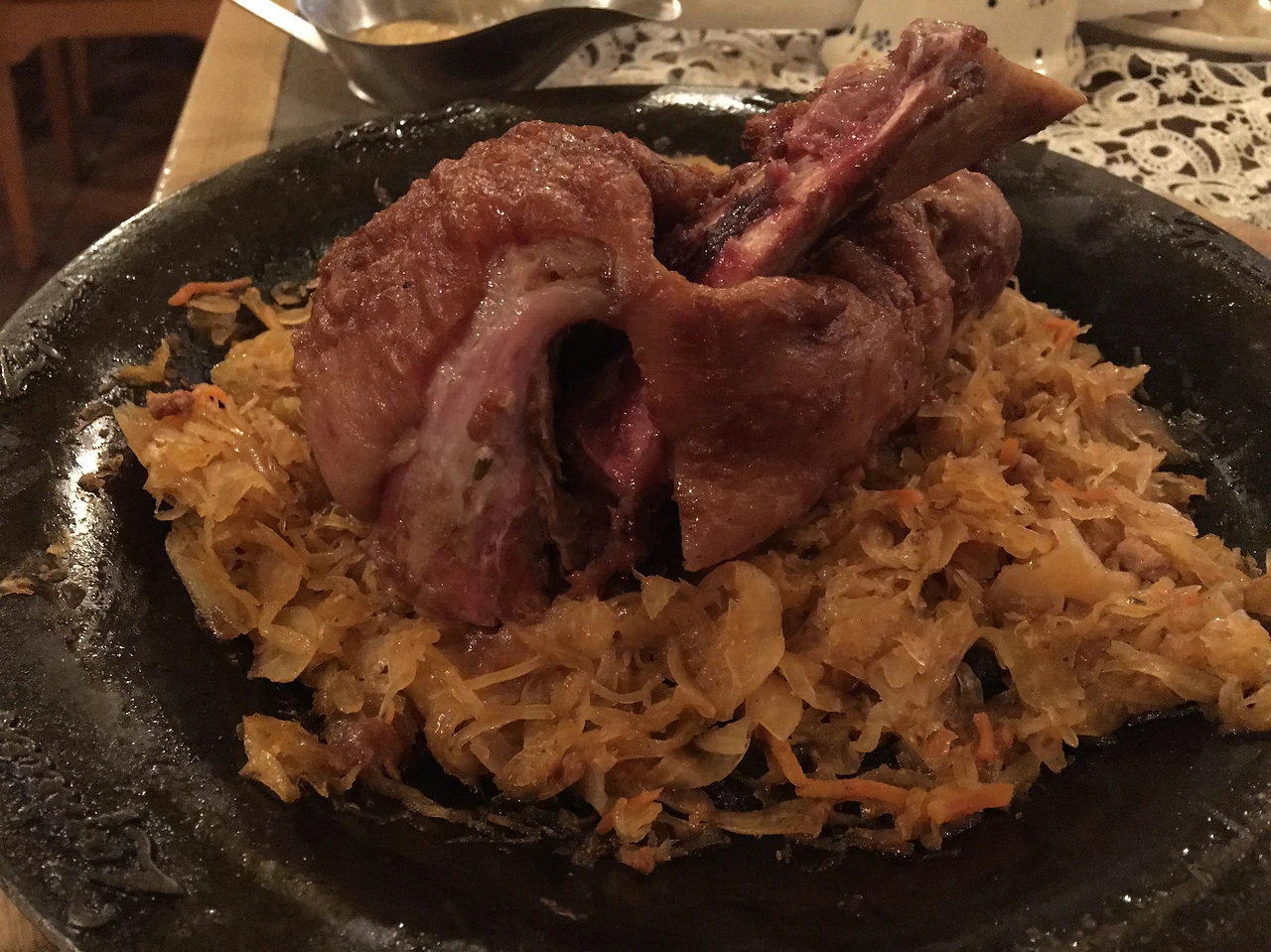 칼도 안들어 갈만큼 바삭하게 껍질을 구워내는 독일의 학센과 달리 체코의 꼴레뇨와 폴란드의 골롱카는 껍질이 부드러운 상태 그대로 서브됩니다. 그리고 골룽카는 폴란드어로 무릎이란 뜻으로, 발목이 아닌 무릎 부위로 만드는 것도 차이점입니다. 학센처럼 껍질과 속의 극명한 식감의 대비는 없지만 전체적으로 부드러운 식감에 먹기가 더 편하기도 합니다. 그러나 셋 다 커다란 뼈 때문에 다소 먹기가 불편하기도 한데 우리가 족발을 먹을 때 뼈째로 들고 먹듯이 유럽인들도 뼈를 들고 뜯어 먹습니다.