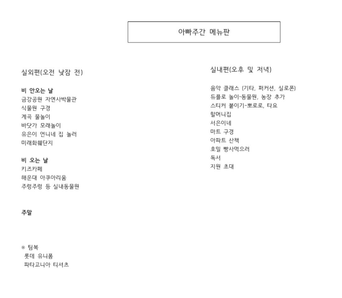 집 주변에 아이와 함께 갈만한 곳과 내 비루한 재주를 총동원하여 아이와 함께 할 만한 활동을 정리해 보았는데 생각보다 별로 할 일이 없어서 난감했다. 재주가 모자라면 파이팅으로 떼우자 싶어 큰 맘먹고 아이와 함께 입을 유니폼도 제작했다. 일평생 응원하고 있는 야구팀의 유니폼에 아이의 이름을 새기고 내겐 아이 이름에 '아빠' 두 글자를 붙여 우리만의 팀복을 맞추었다. 어렸을 때부터 숙원사업이었던 일을 완료하니 아이와 그 어떤 일도 함께 할 수 있을 것만 같은 자신감과 아이를 향한 애정이 마구 솟아올랐다.