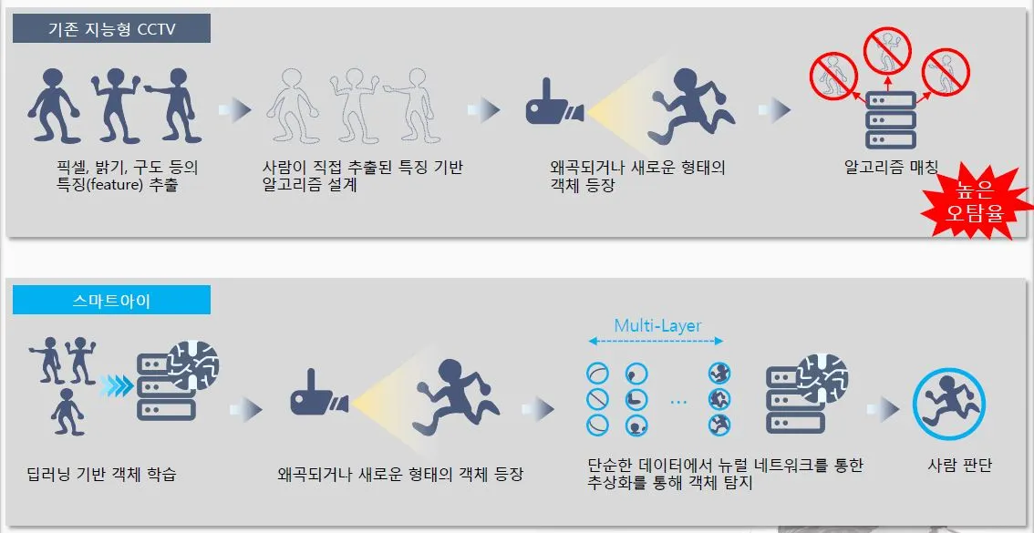 그런 한계를 극복하게 해준 것이 바로 AI(인공지능)이에요. 지금 우리가 살고 있는 시대는 4차 산업혁명시대라고 하면서 인공지능, 빅데이터, 클라우드 등 얘기를 많이 하잖아요? 그 것이 CCTV에도 도입되기 시작했어요. 신경망 구조를 모방한 머신 러닝(Machine Learning) 계열 AI 기술인 딥 러닝(Deep Learning)이 현실화되면서 영상분석에 접목되기 시작했는데, 룰 기반에서 딥 러닝 기반으로 지능형 CCTV가 개선되면서 정확도가 엄청나게 개선되었다고 해요. 이제는 사람과 동물을 넘어 철수와 영미까지 구분할 수 있게 된거에요.